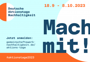 Auch dieses Jahr finden die Deutschen Aktionstage Nachhaltigkeit vom 18. September bis 08. Oktober statt und möchten wieder viele Menschen dazu bewegen, in zahlreichen Aktionen ein Zeichen für eine nachhaltigere Welt zu setzen – erstmalig auf der Webplattform Gemeinschaftswerk Nachhaltigkeit!