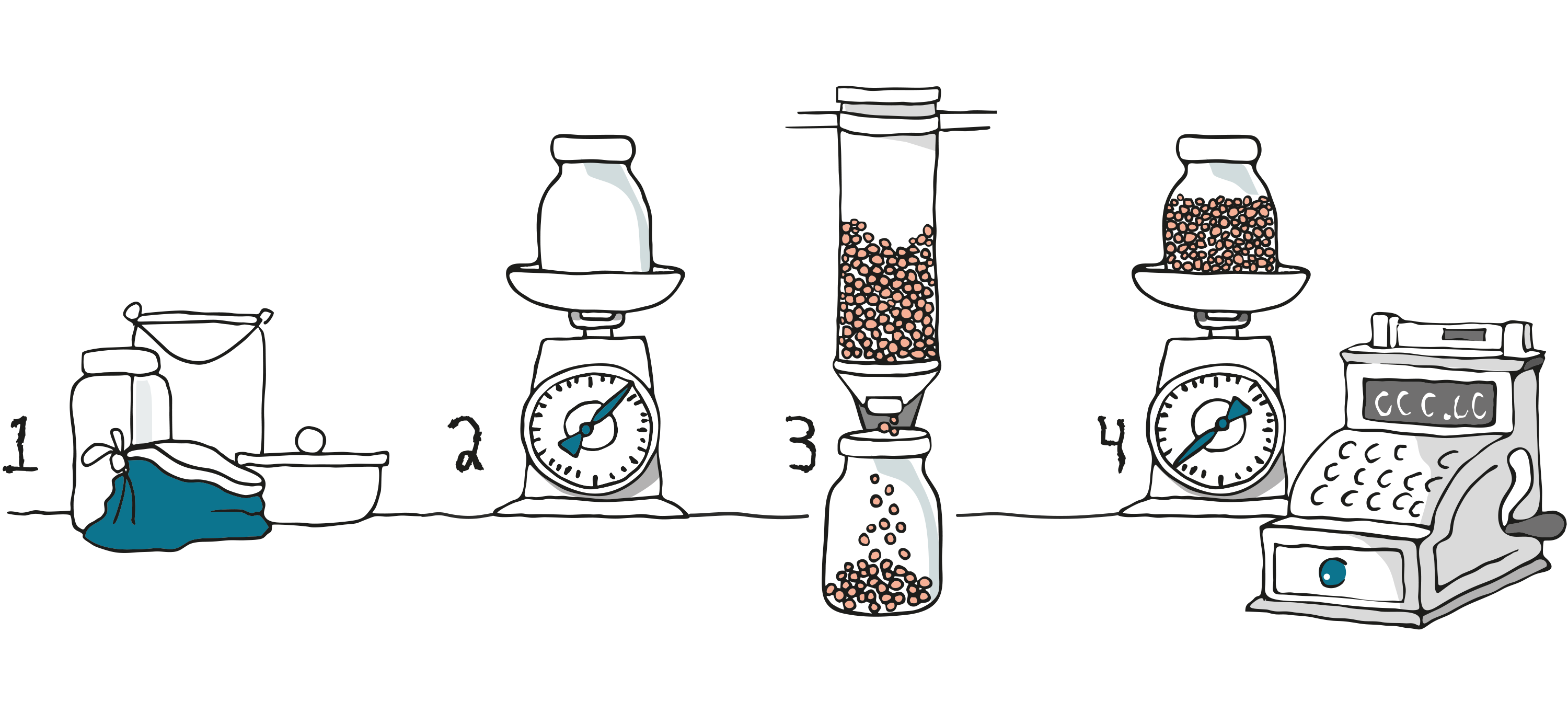 - Am Schluss kommst du mit deinem Einkauf zur Kasse. Hier wiegen wir erneut deine Behälter und ziehen das von dir notierte Gewicht ab. So bezahlst du nur den Inhalt.